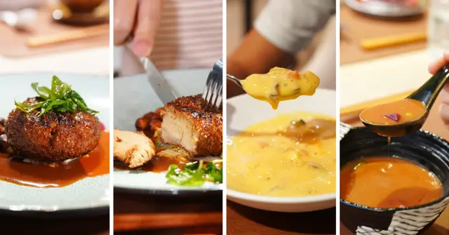 ▼脆口的腰果搭配發酵菜心,提供了獨特的酸香味,與四季豆拌辣油、柚子汁的微酸與清新形成對比。蒟蒻的柔滑口感在野菜叢林醬的包裹下更顯特別,整體清爽不油膩,適合在餐前享用開胃!