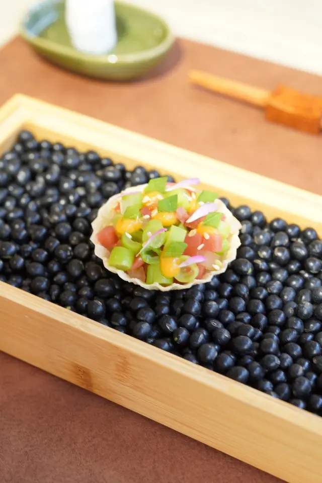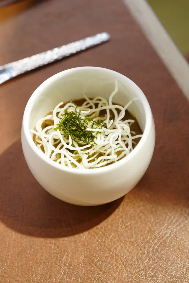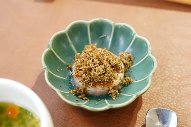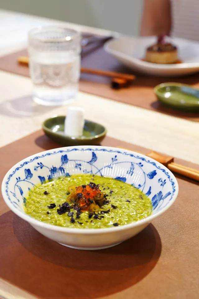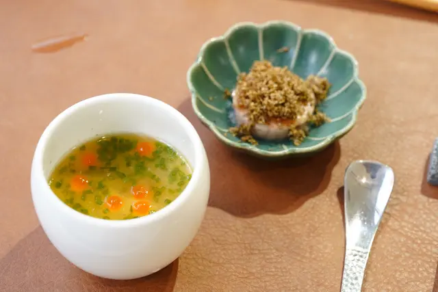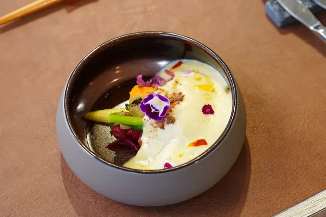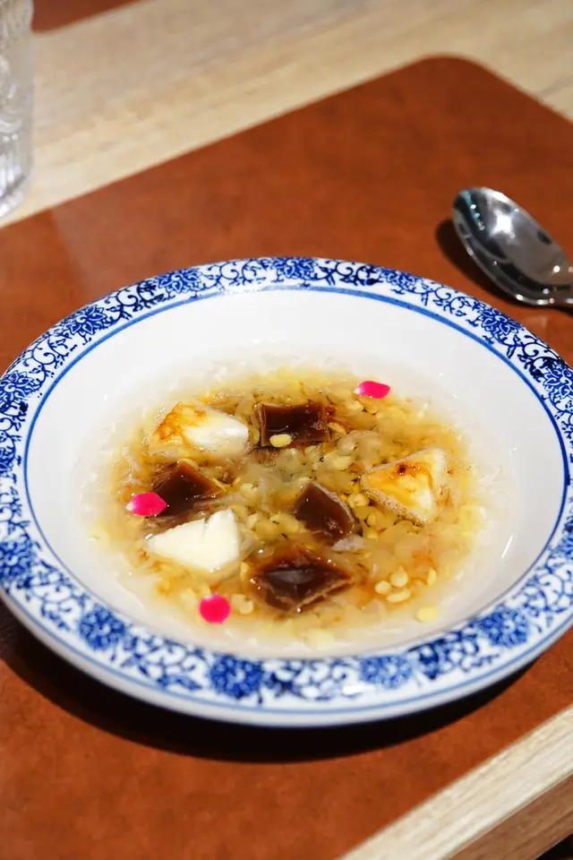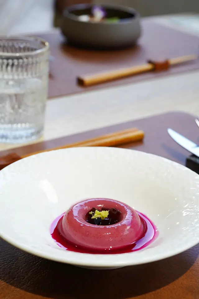 ▼甜菜根與黃豆手工製成的豆腐,口感細膩滑順,展現了食材的自然甜味。醬油昆布晶凍增添了鹹鮮提味,而阿里山現磨山葵則為注入了一絲辛香。底部甜菜根高湯溫潤且帶有甜味,完美融合了所有元素,讓人彷彿沐浴在夏日暖陽下。