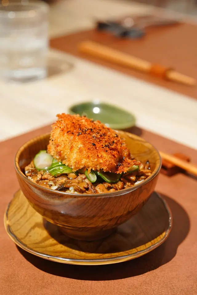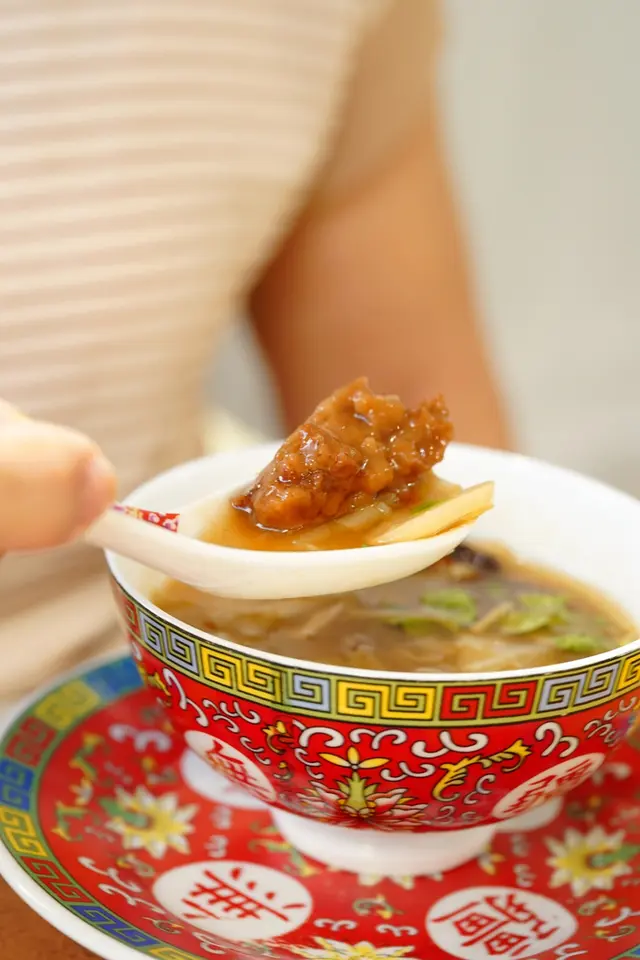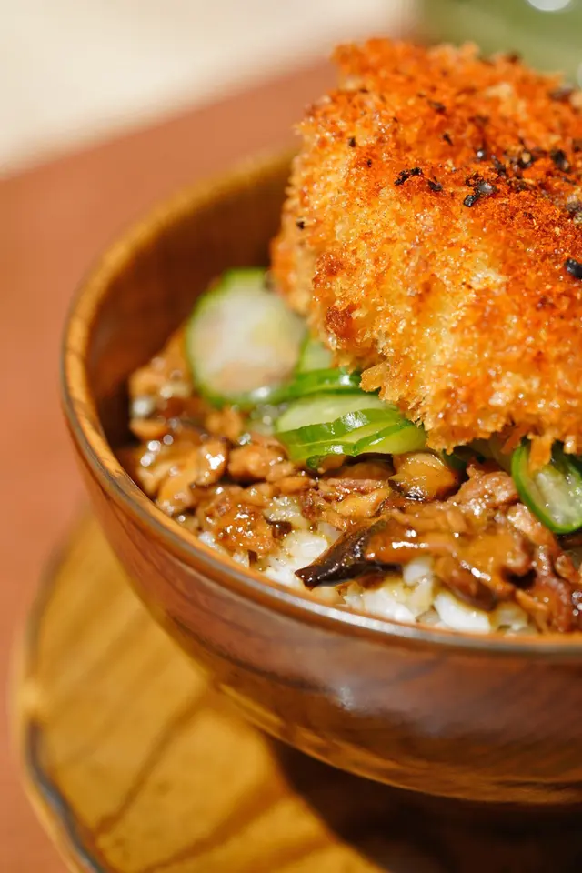 ▼令人驚艷的素食肉燥飯!視覺上非常吸引人,選用的食材也非常講究,猴頭菇和南投武界的乾香菇的搭配,讓素肉燥的口感更富有層次。搭配台梗九號米和些許糙米,不僅吃得飽足,還攝取了豐富的纖維質。醃黃瓜的清爽解膩,以及半熟炸靈芝蛋,鮮甜、沒有絲毫腥味,好適合戳破用蛋汁混著米飯吃!