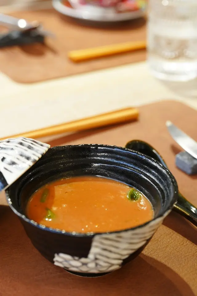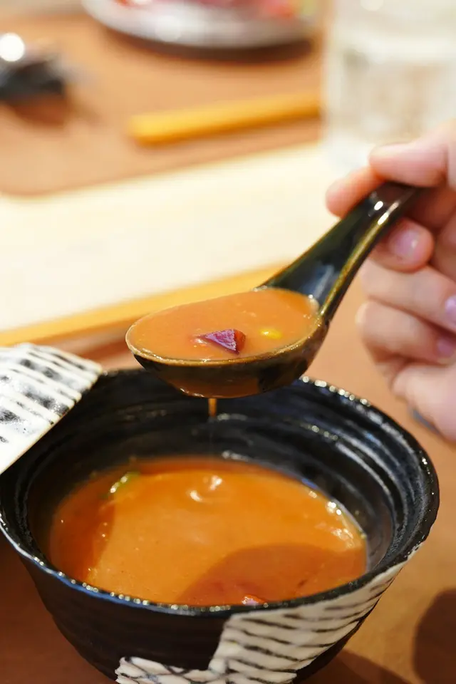 ▼以甜菜根和多種蔬菜熬煮而成,湯頭紅潤誘人。濃稠的質地來自於白米和甜菜根的自然融合,讓每一口都充滿豐富的濃稠口感,喝起來蔬菜風味濃郁甜美。