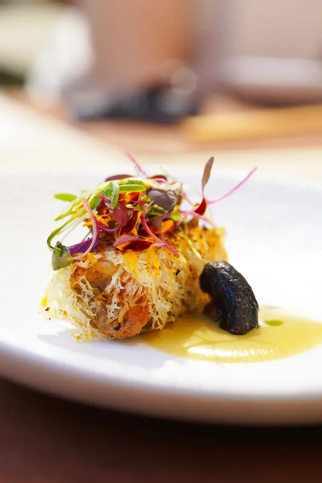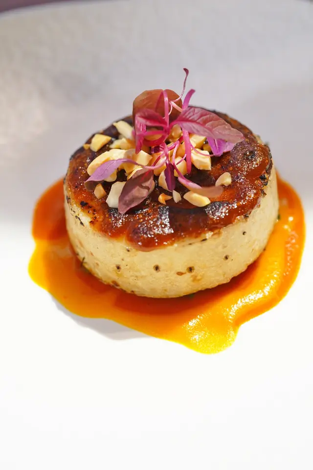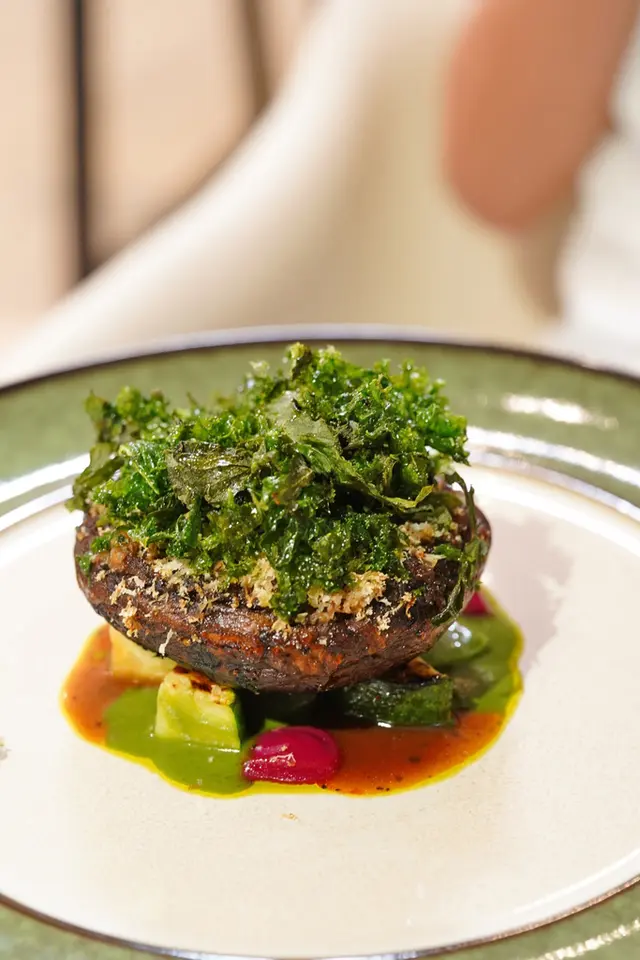 ▼將東南亞風味巧妙融合,炭烤猴頭菇吸收了香茅的香氣,帶來獨特的炭烤風味,搭配泰式紅咖哩醬汁辛香撲鼻;山當歸蔬菜醬汁增添了草本清香,平衡了咖哩的濃郁味道。當季炭烤虎豆的香甜,奶油櫛瓜的奶香多汁,整體口感更加豐富飽滿。
