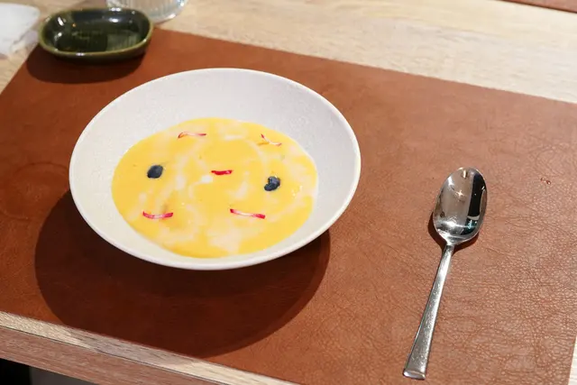 ▼以夏天有機蔬菜為基底,搭配自製的漬物而成的夏日沙拉,展現出清爽與自然的風味。新鮮玉米製成的慕斯細膩柔滑,帶有甜美的玉米香氣,而炙燒過的玉米粒則增添了一層焦香的口感,層次豐富。