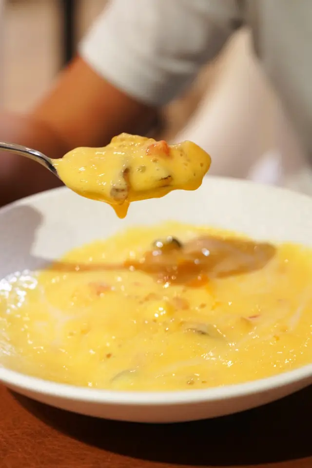 ▼一道是蒸蛋,結合了帕瑪森起司和黑松露的獨特風味,上層點綴的甜椒素鮭魚卵則增添了鮮甜與有層次的口感,是一道令人享受的滑順美味。
