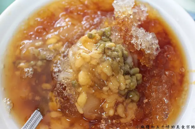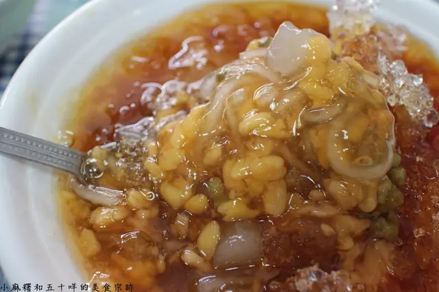 綠豆蒜冰,上面糖水帶點特有的酸香味,配上碎冰,先享受一下糖水單純的滋味,配料有粉條,Q粉,綠豆及綠豆蒜,口味口感大多正常,但是粉條和Q粉似乎有點粉的生味,有點像是煮過頭的感覺,當天口感沒有很喜歡。