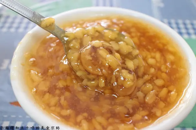 綠豆蒜(熱),綠豆燉煮到一整個粉碎到透,帶有一點澱粉甜味,香味淡雅。