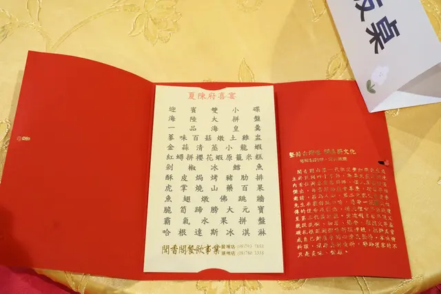 ▼不免俗地看一下菜色,辦桌廠商是聞香閣宴會餐廳。看介紹,聞香閣是一家傳承三代、經營超過70年,以辦桌起家的老字號,在高屏地區頗負盛名。