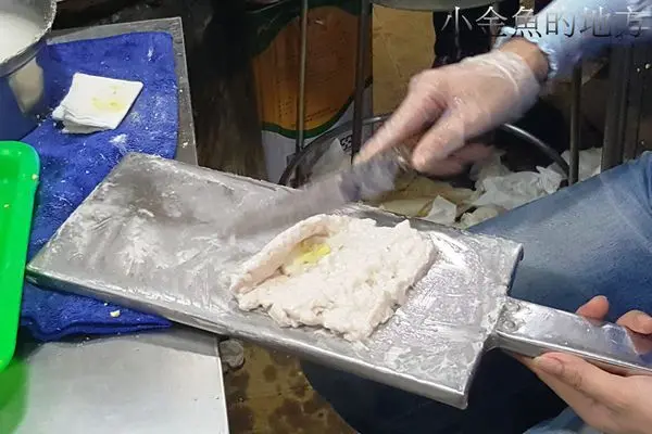 快速地用魚漿包裹起來後丟到大大的油鍋現做現炸