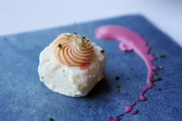 煙燻鮭魚與辣根醬慕絲的巧妙組合,紫紅色醬汁部分是使用紅甜菜泥非常對味