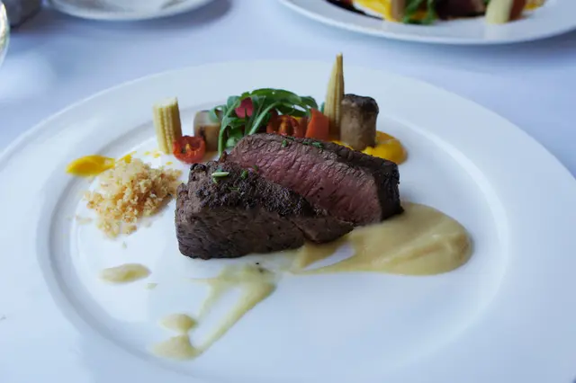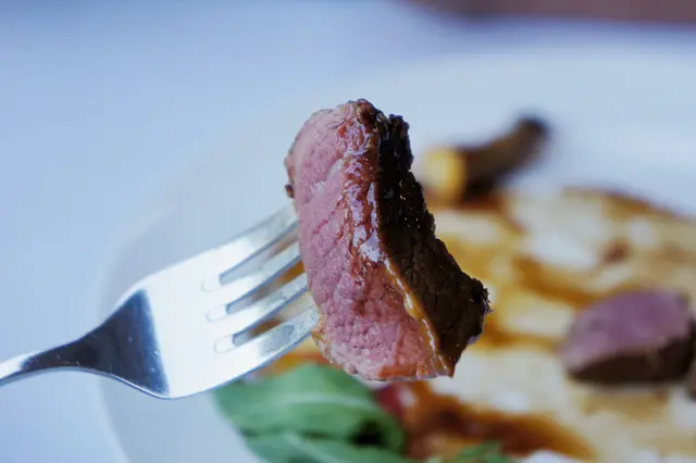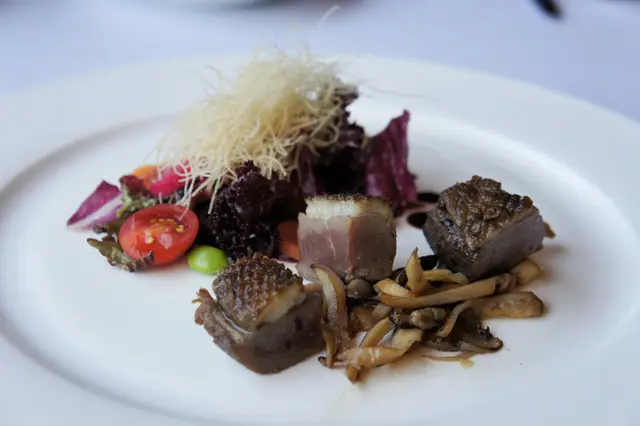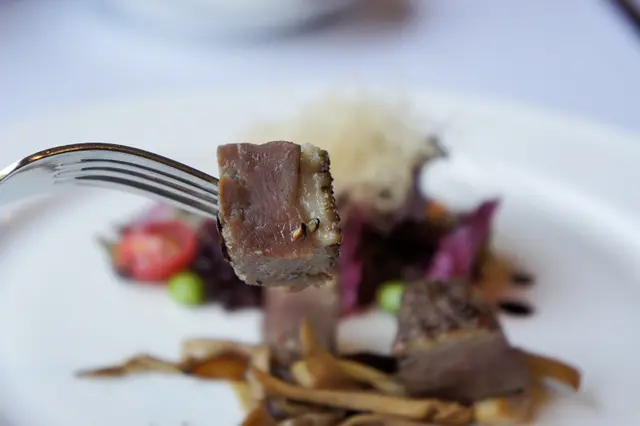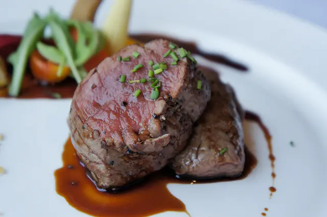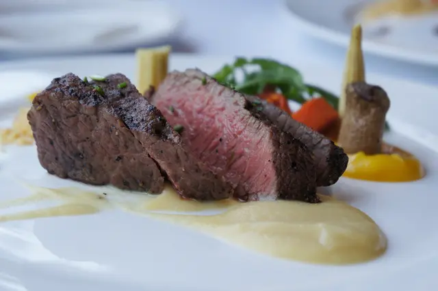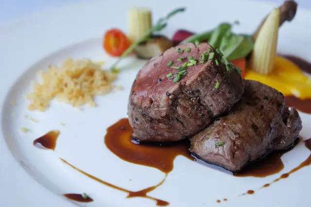 油脂鮮美,輕咬一口肉汁就會爆出來,嘴裡滿滿的都是牛肉的香味 ,沾一點紅酒醬汁,讓口感更升級享受頂級的味覺饗宴