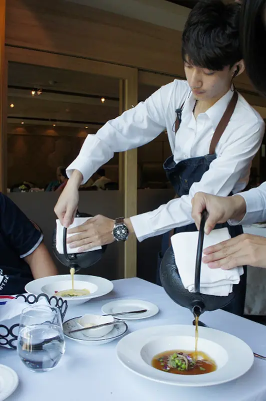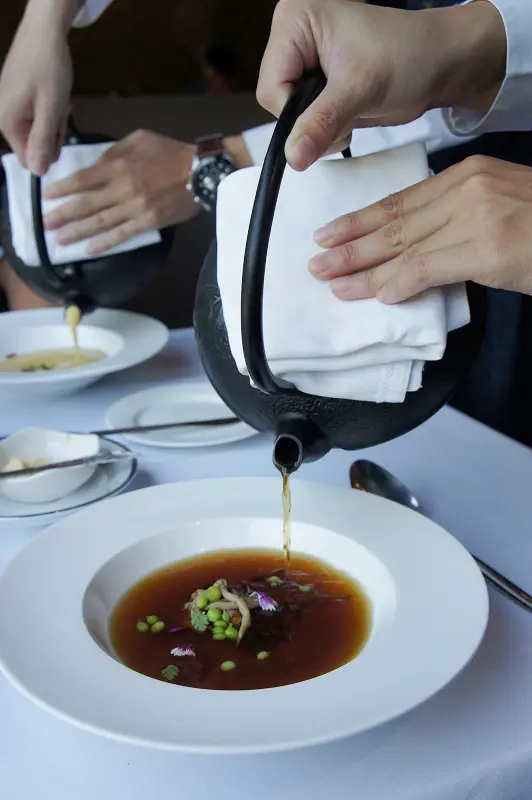 服務人員用黑色的鐵壺倒入雞肉清湯