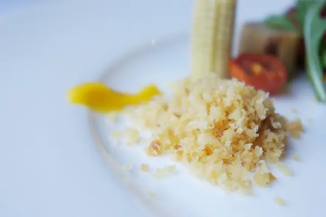一旁的配菜有小玉米、番茄、杏鮑菇、紅蘿蔔、芝麻葉