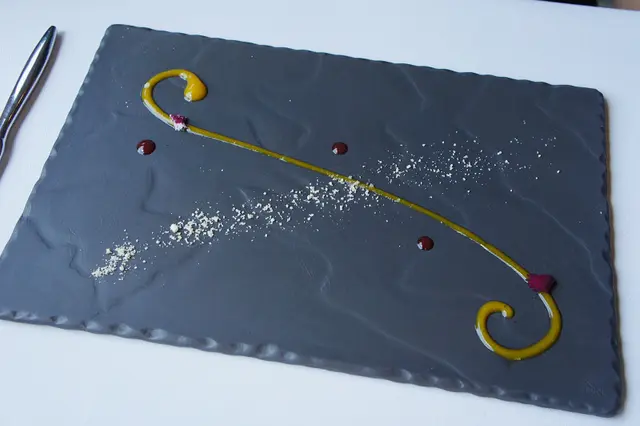 接著放上黑色岩盤,上面有果醬畫上的優美曲線及小花瓣點綴,整體看起來宛如藝術品一般,沒錯!最期待的米其林甜點餐車要登場囉