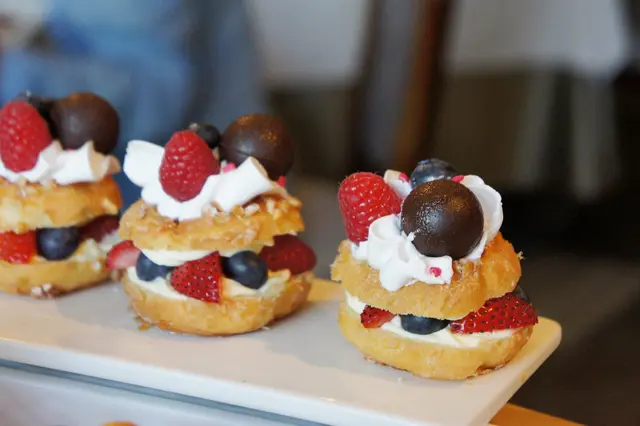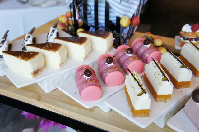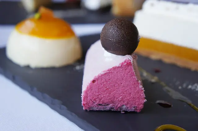 右邊數來第二個很漂亮的粉紅色是紅桃慕絲:旁邊搭配的是馬卡龍,口感上也是重酸甜一點