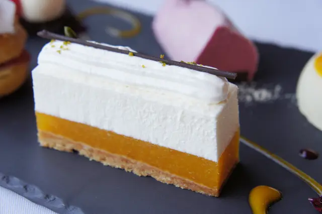 香橙優格起司:底部有搭配榛果餅乾,口感上是微酸,經過冷凍後慕絲吃起來是冰淇淋的感覺
