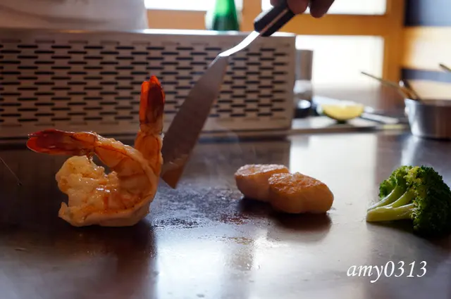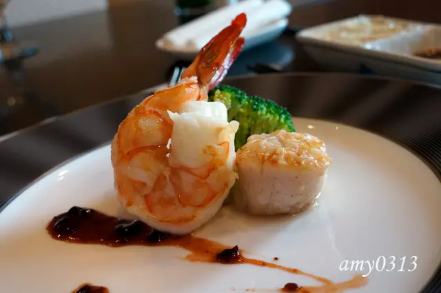 很喜歡吃鐵板燒的海鮮,因為鐵板的溫度夠高,能把海鮮的美味烹調得很棒,像這天的明蝦和干貝都很鮮美好吃。