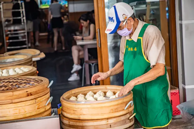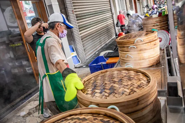 門口處是蒸湯包的地方,老師傅從一開門就一直蒸到打烊,就算開了四個爐在蒸,感覺出爐好像都來不及賣,湯包一到前面就被夾光了,湯包剛出來的模樣真是誘人,白白胖胖的還冒著熱氣,蒸好的湯包端到湯包裝區一下子就秒殺了