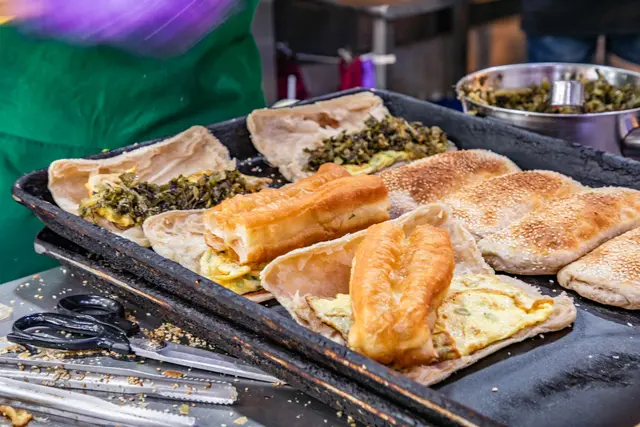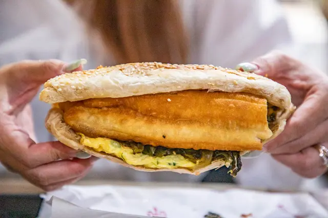 燒餅大全套,油條、蔥蛋、酸菜全加,一整個就是爆滿,要一口咬下所有的料嘴吧大概要打開到極限才有辦法,燒餅吃起來很香,還有滿滿的烤芝麻香氣,再來酸菜真的很棒酸甜帶點脆,加上酥香的油條跟嫩蛋,吃起來很有層次感,但吃到後面有點乾,配點飲料會好一點
