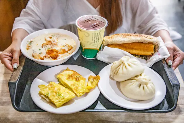 我們點了湯包、大全套燒餅、鹹豆漿、檸檬烏龍、蛋餅,內用會給你托盤裝,桌上也有醬料,吃完要自己把托盤跟垃圾拿到自助區唷