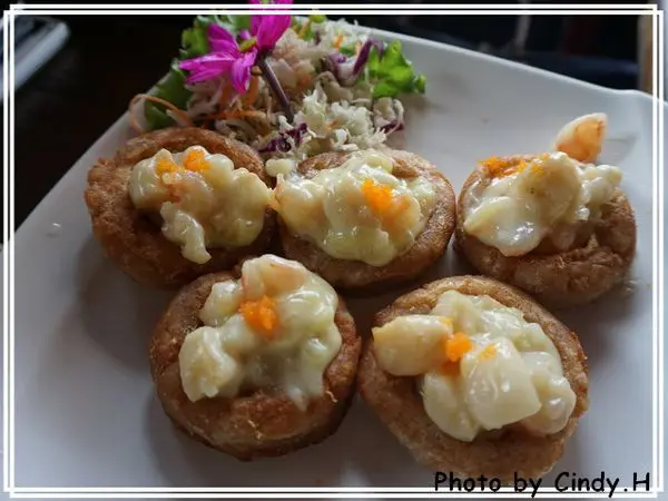 我本身還滿愛芋頭這樣食材的,而這道芋香盅聽說是他們家的招牌,點來試了之後還真的很不錯。下面碗狀造型的是用芋泥跟太白粉(?)捏成碗狀後油炸而成,吃起來QQ的且很有芋香,而上頭是美乃滋拌貝柱及蝦仁,搭配起來還不錯~