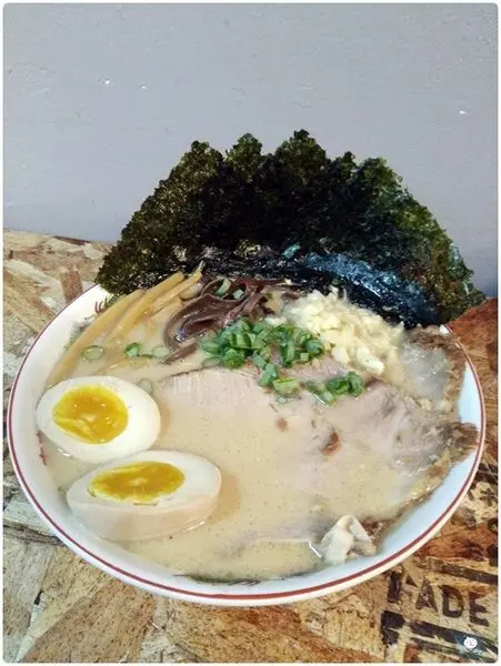 兩片叉燒、整顆溏心蛋、五片海苔、特製蒜油、蒜泥、蒜末、木耳、筍乾、蔥花。