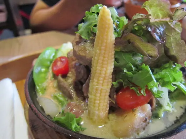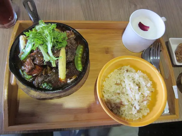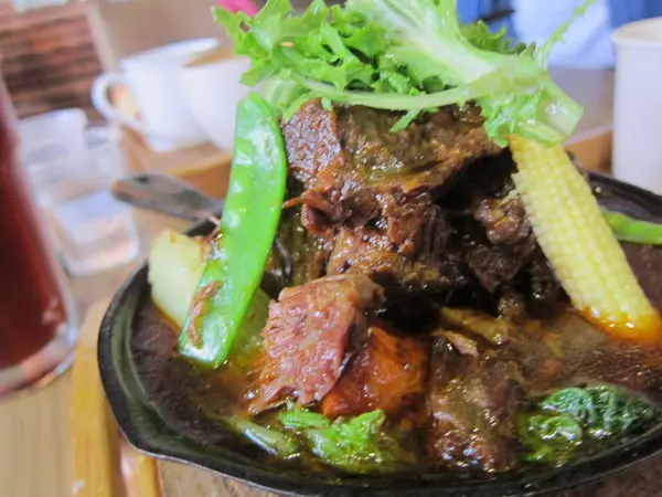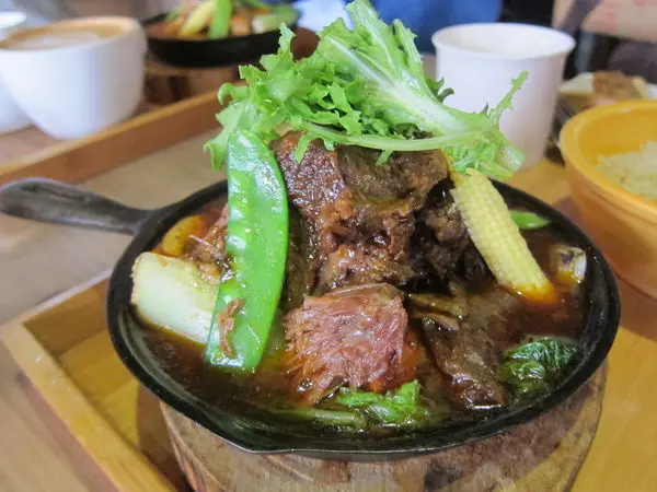 一塊塊大塊的牛肉在鐵盤上堆疊而起,底下有著的是蔬菜們,就是一種讓你吃肉也吃菜的健康概念