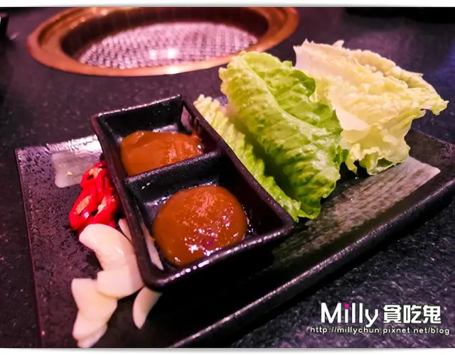 還有一盤生菜、蒜片、辣椒和烤肉沾醬