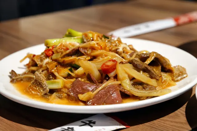 炒牛雜是一道風味獨特的美食,由牛肚和牛雜多種部位搭配蔬菜和調味料炒製而成,大火快炒過程中,發出誘人的香氣,令人垂涎欲滴。融合了不同部位的牛雜,每個部位都有獨特的質地和味道,使得整道菜餚口感豐富多樣,值得品味和享受!