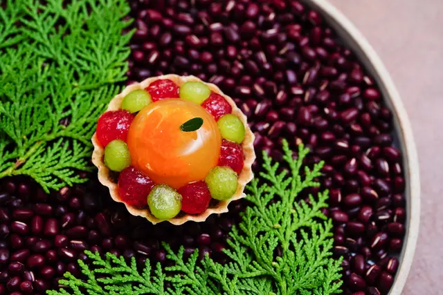 中間是像仙桃的果凍,以蜜金棗+桔醬製成,點綴胡椒木葉,吃起來會帶點花椒香氣,搭配西瓜大根+客家桔醬美乃滋,香瓜紫蘇球、洛神凝膠球。