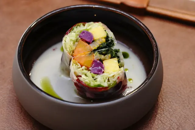 發想自越南春捲的概念,春捲皮刷上一層發酵汁,帶有天然酸味;餡料選用春天當季的有機蔬菜,萵苣、紫蘇、自己醃漬的洛神花等等蔬菜,包入三種不同的地瓜:清蒸紫地瓜、炭烤黃地瓜、酥炸紅心地瓜,底部是白花椰菜泥。