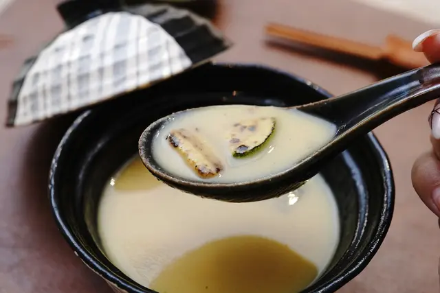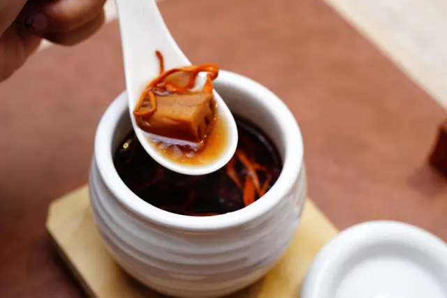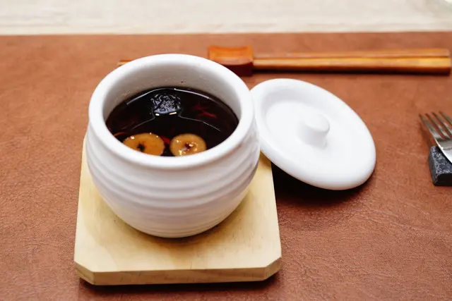 使用何首烏傳統藥材,加入四種菇類:冬菇、帝王菇、柳松菇、蟲草花,將菇類的鮮味熬煮釋放在湯中,即便是素食料理,喝起來依舊鮮美鮮甜。