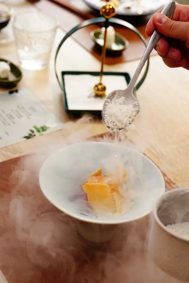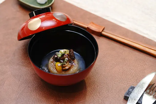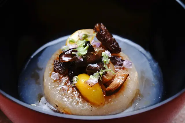 以傳統日式料理方式熬煮的蘿蔔,慢火煮一個半小時,然後浸泡隔夜,再用香菇花椒油大火煎過,蘿蔔入味但口感紮實飽滿。上面搭配炭烤鹿茸菇、日本銀杏;底部搭配東北角的紫菜,提供更豐富的鮮味海味。