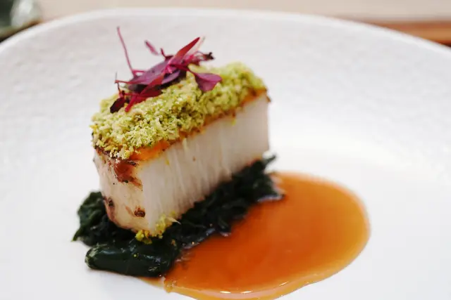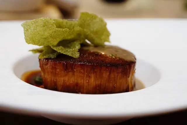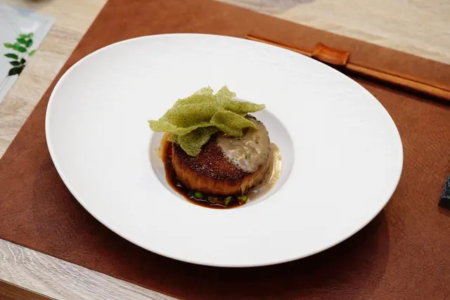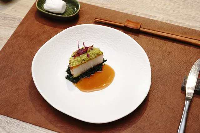 原來是胖胖菇,size最大的金針菇,主廚取中段最扎實的部分大火煎過,保持爽脆的口感,佐以當歸蔬菜醬汁,奶油燴毛豆,上面像波浪的是酥炸綠海藻脆片,增添濃郁海味。