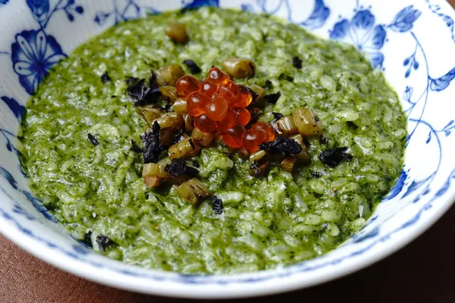 使用台梗九號米,呈現傳統義式燉飯帶點米心的口感,我們家很喜歡這種不會太爛的米飯口感~青醬是用山茼蒿製成,很特別的青醬風味,第一次吃到!搭配發酵過的菜豆、烘乾過的海菜、素食鮭魚卵,對我們來說都是全新的素食料理滋味。