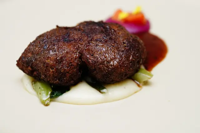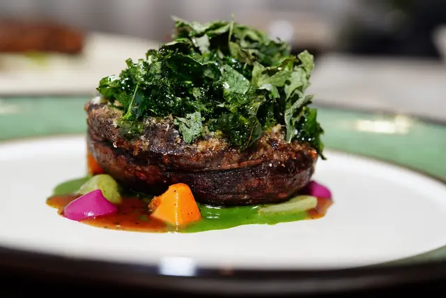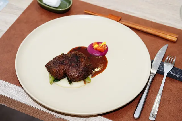 炭烤波特菇,中間是手炒至少兩小時的蕈菇泥(4~5種菇類+栗子+薏仁),底部是三種蔬菜熬製的翠綠醬汁、以及馬告褐色醬汁,吃起來波特菇軟嫩多汁,搭配兩種醬汁味蕾層次感很豐富。
