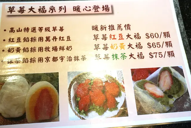 賣的東西主要有麻糬、大福、米點心以及牧場鮮奶酪,口味數量算正常價格的話麻糬跟大福的部分小月是可以接受的,雖然口味很多但是有些都是搭配季節性水果哦!所以不是什麼時候都能吃到自己想要的口味。