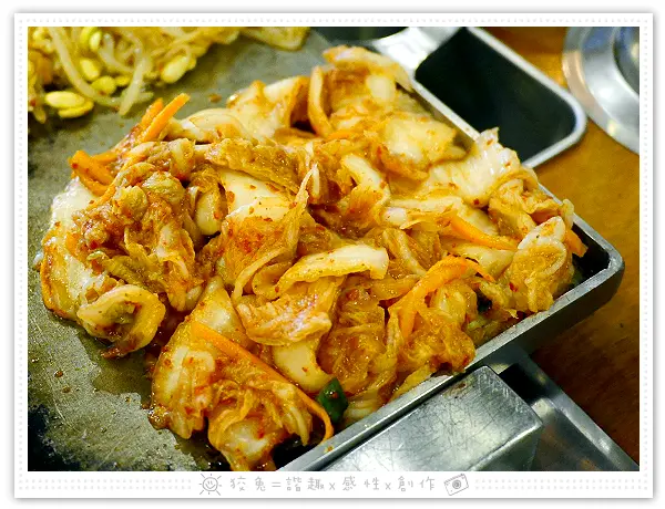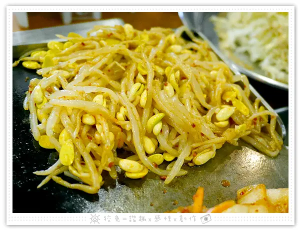 傾斜的韓式鐵板,餘油能順勢流進集油槽,泡菜、豆芽菜卻也因此沾油,