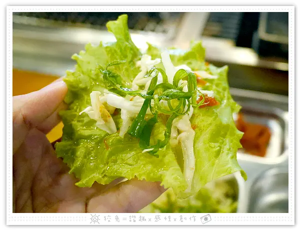 小瑋請我們DIY拿起一片生菜,塗上味噌醬再放上高麗菜絲、蔥沙拉。