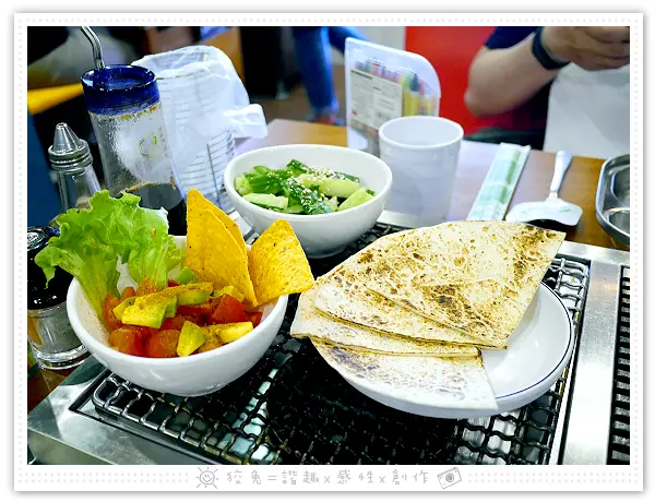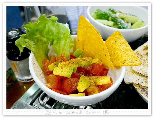 墨西哥風味的番茄酪梨沙拉,配上多力多滋餅乾,視覺呈現大加分。