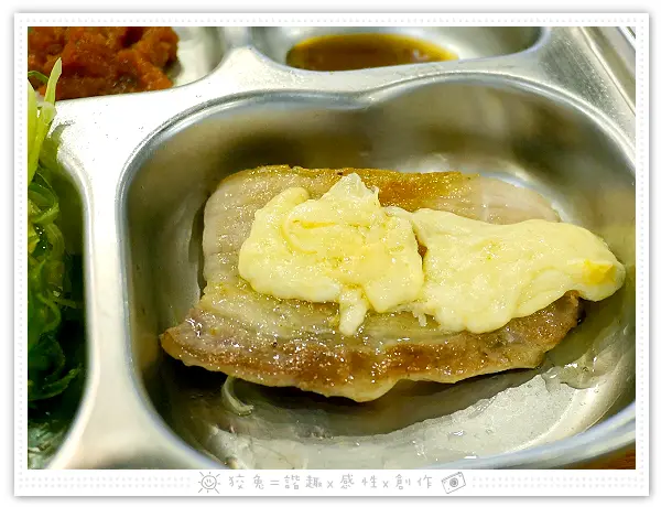 我不太懂這種設計,老闆認為口感油潤較美味?若介意就盡量夾上方配菜!