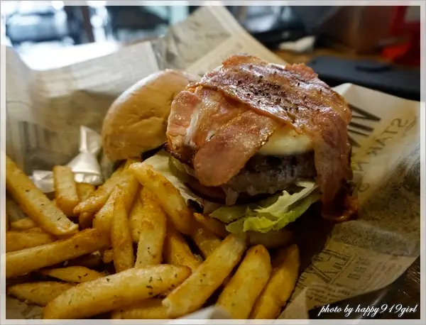 培根牛肉堡看起來頗有份量,一口咬下肉汁隨即從缺口噴了出來
