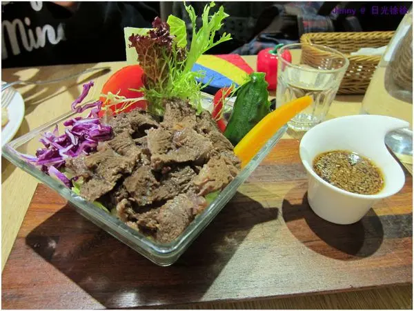 牛肉莎拉配的佐醬是芝麻香柚醬