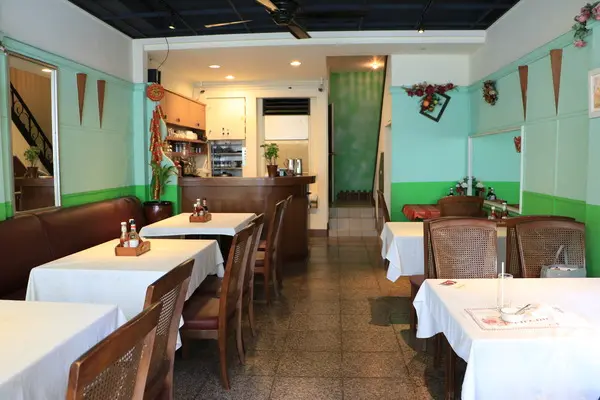 店內裝潢保留當時原貌,淡綠色色系搭配懷舊長型靠背沙發、藤椅與白色桌巾,讓整個用餐環境感覺溫暖又有味道。