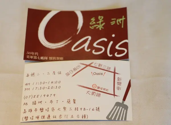 相信高雄在地人,一定都知道位於鹽埕七賢三路上有間老字號的綠洲西餐廳,而這裡曾經是五○年代最時髦的西餐廳。隨著1951年越戰的爆發,美軍第七艦隊進駐高雄三號碼頭,七賢三路這一帶是當年最著名的的酒吧街。本來經營西式三明治與咖啡的綠洲咖啡廳因應美軍需求,遂於1971年開始,聘請左營美國招待所的廚師來當主廚,逐步推出最道地美國風味的快餐、漢堡、牛排等等,相當受歡迎的,據說當時最興盛時期還聘請3位主廚呢。隨著美軍撤台消失後,酒吧街早已不復見,綠洲西餐廳依然屹立不搖。
