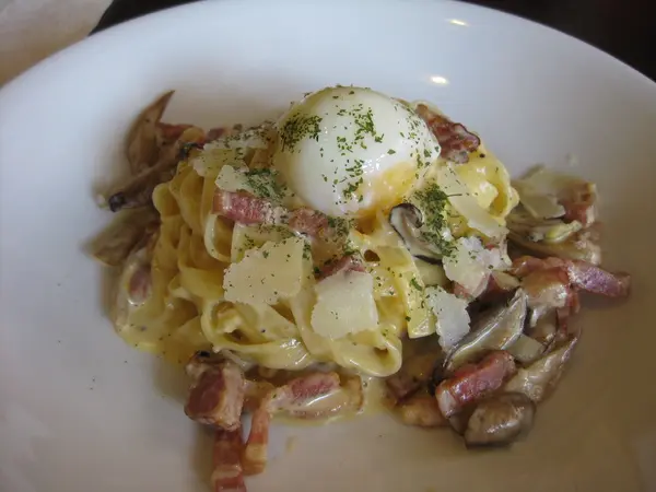 Peter點了 帕米加諾培根蛋乳寬麵搭半熟蛋 (240元)