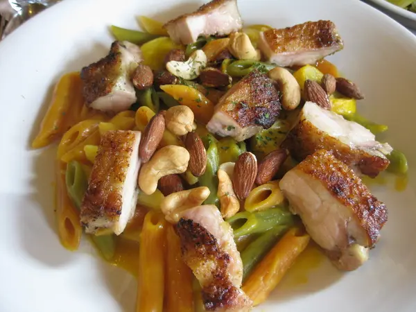 我點了南瓜甘薯醬香料煎烤雞肉櫛瓜三色筆尖麵 (240元)