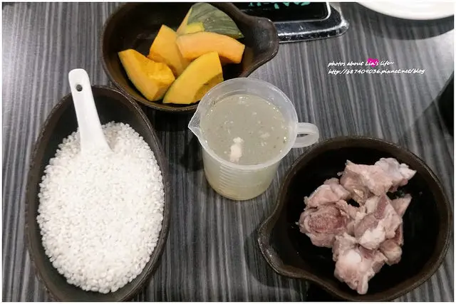 點完餐就立刻端上白米、排骨、高湯和南瓜(or芋頭)熬煮養生粥