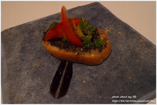 當晚的開胃小點是抹了油醋醬的酥脆法式麵包再放上橄欖 帶酸的濃郁味道的確勾起旺盛的食慾(笑)