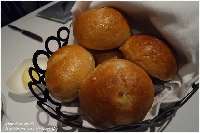 正覺得一片麵包吃不過癮...立刻出現整籃現烤的小圓麵包 溫熱鬆軟的美味不抹奶油也好吃