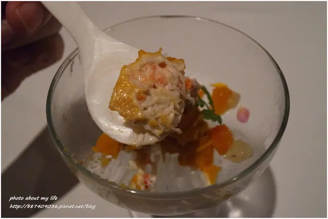蟹肉、甜薯、繽紛柑橘水果入口最先嚐到綿密地瓜(甜薯)泥的甜味