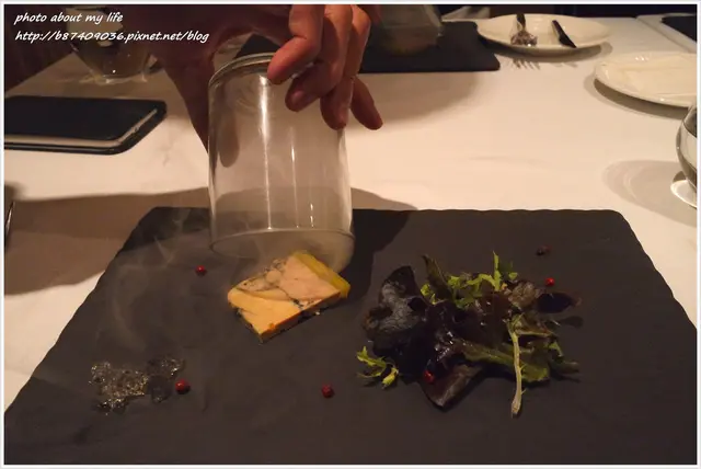 蓋著松露鴨肝的玻璃杯裝了核桃木的燻煙 打開立刻飄散燻木香味即使散去仍能在鴨肝聞到濃郁香氣~~~